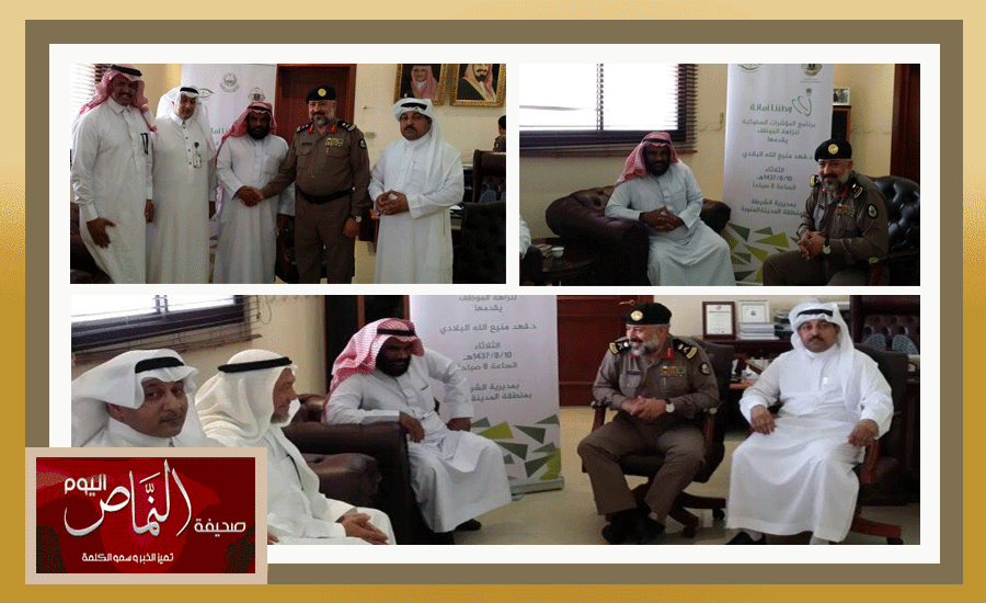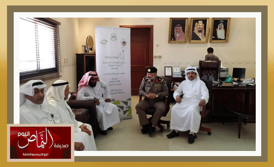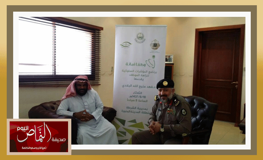استقبل مساعد مدير شرطة منطقة المدينة المنورة اللواء محمد الشهري ، في مكتبة بمديرية الشرطة، الدكتور فهد منيع البلادي الذي يقدم ندوة ( الأمانة ) وذلك ضمن برنامج المؤشرات السوكية لنزاهة الموظف، وقد رحب اللواء الشهري بالدكتور البلادي ومرافقيه وشكر لهم مايقومون به من خدمة نموذجية وفريدة متمثلة في تفعيل برنامج المؤشرات السلوكية لنزاهة الموظف، فيما قدم الدكتور فهد البلادي الشكر والتقدير لسعادة اللواء الشهري لحسن الأستقبال وحفاوة اللقاء، وذكر أن ما يقدمونه في هذا البرنامج إنما هو من أجل الرقي بمستوى الموظف في جميع القطاعات الحكومية وذلك خدمة للدين والوطن .