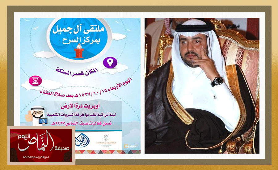 بمناسبة رعاية محافظ النماص الأستاذ عبدالله العجيري لحفل آل جميل بمركز السرح ( قاعة المملكة ) وزيارة مركز السرح … وجه سعادة رئيس مركز السرح الأستاذ عبدالله بن علي بن محيا دعوته – للاجتماع اليوم الأربعاء 15/10/1437هـ في تمام الساعة الحادية عشرة صباحا – لكل من سعادة مدير مخفر شرطة السرح وسعادة رئيس مركز الدفاع المدني وسعادة رئيس مكتب الخدمات البلدية بالسرح وسعادة مدير الرعاية الصحية الأولية بحلباء ومنسوبيهم وحضور لجان الملتقى، ويهدف الاجتماع إلى الاطلاع على الترتيبات النهائية للملتقى ومناقشة الصعوبات لتذليلها إن وجد، وجدير بالذكر أن الملتقى سيختتم أعماله بعد صلاة العشاء غداً الأربعاء ويتم تكريم حفظة كتاب الله والمتميزين دراسيا من أبناء آل جميل ومن فقرات الملتقى – أوبريت بعنوان ( درة الأرض ) وهي ليلة تراثية تقدمها فرقة السروات الشعبية ضمن فعاليات صيف النماص ١٤٣٧هـ.