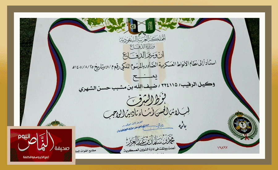 حاز الوكيل رقيب ضيف الله مشبب المشهوري الشهري على ترقيتان استثنائيه ليحصل ويتقلد رتبة رقيب اول بعد عدة اصابات متفاوته بالحد الجنوبي ومنحه نوط الشرف من وزير الدفاع ، وقد منح عدة اجازات مرضيه الا انه ابى ورفض منها ليعود ويشارك زملائه لذود والدفاع عن دينه ووطنه مقدما روحه فداء للدين والوطن – صحيفة النماص اليوم – تبارك للرقيب اول ضيف الله مشبب المشهوري هذا الفخر ولقبيلته بني مشهور سراة وتهامه .