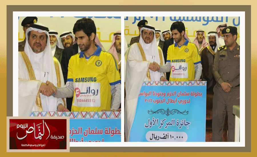 رعى سعادة محافظ محافظة النماص الأستاذ : عبدالله بن عائض العجيري – الليلة – حفل نهائي دوري أبطال الجنوب لكرة القدم في نسخته الثامنة ، على كأس التنمية السياحية ، تحت شِعار #سلمان_الحزم ، وقد شرُف الحفل بحضور النجم الإعلامي الكبير : محمد سعدون الكواري – مذيع قنوات بي إن سبورت – ، ابتدأ الحفل بمباراة استعراضية بين فريقي ” الأهلي ” و ” ريال مدريد ” شارك فيها النجم الإعلامي القطري ” الكواري ” ، عقب ذلك بدأت مباراة النهائي بين فريقي ” رومـا ” و ” السالميـة ” ، انتهت بفوز الأخير بثلاثة أهداف لهدف واحد ، ليتم بعدها تتويج الفريق الفائز بكأس البطولة ومبلغ ١٠ آلاف ريال ، وتكريم أفضل لاعب في المباراة ، وهداف البطولة ، وأفضل حارس ، وحكام المباراة ، فيما كان هناك تكريم من نوع خاص من مُلّاك أكاديمية كاردف الرياضية للنجم الإعلامي القطري الخلوق : محمد سعدون الكواري ، أثنى بعدها على هذه الاحتفائية الخاصة ، وأشاد بالجهود المبذولة في دعم الشباب والرياضة بمحافظة النماص الجزء الغالي من أرض المملكة العربية السعودية .