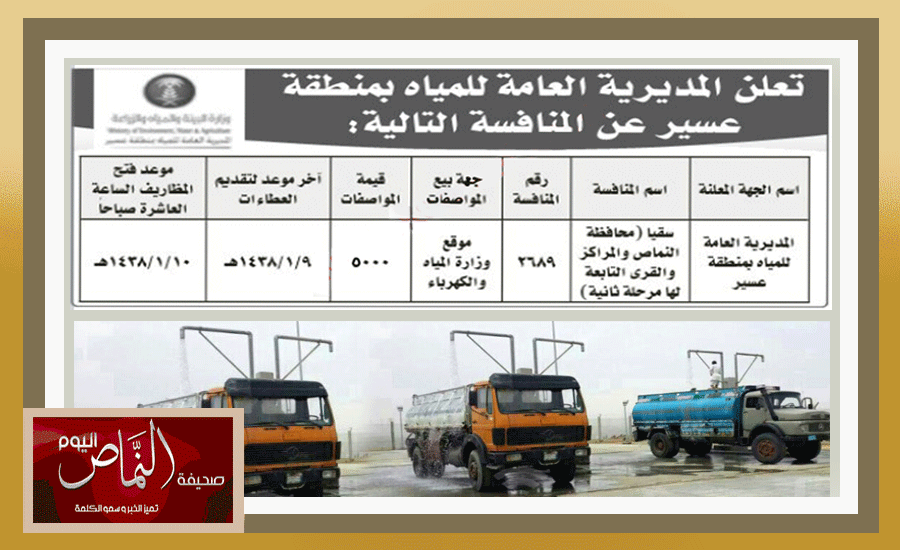 أعلنت المديرية العامة للمياة بمنطقة عسير عن منافسة سقيا محافظة النماص والمراكز والقرى التابعة لها عن المرحلة الثانية برقم 2689 وسيكون بيع المواصفات بوزارة المياة والكهرباء بقيمة 5000 ريال ، وسيكون آخر موعد لتقديم العطاءات بتاريخ 9/1/1438 ، وفتح المظاريف بتاريخ 10/1/1438هـ الساعة العاشرة صباحاً .