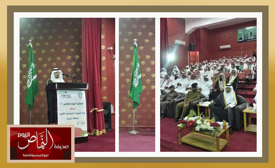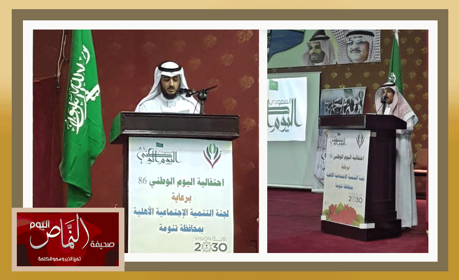 حيث بدأ الاحتفال بالسلام الملكي السعودي ثم آيات عطرة من الذكر الحكيم ثم كلمة محافظ تنومة رفع من خلالها أسمى آيات التهنئة والتبريكات لمقام خادم الحرمين الشريفين وسمو ولي عهده الأمين وسمو ولي ولي العهد بمناسبة الذكرى الغالية على وطننا ، وتطرق إلى ما تعيشه بلادنا من رخاء وازدهار وتقدم ونهضة على كافة الأصعدة في جو مفعم بالأمن والإيمان سائلا المولى جل في علاه أن يحفظ بلادنا وحكامنا وعلماءنا وأن يديم عليها وافر نعمه ، بعد ذلك قدم الإعلامي /فهد الشهري لوحة نثرية وطنية عبرت عن رؤية 2030 تناول خلالها المحاور المهمة التي تضمنتها الرؤية والآمال العريضة المنعقدة بعد عون الله تعالى على هذه الرؤية المباركة ، بعد ذلك استمع الحاضرون إلى قصيدة وطنية من نظم الشاعر /سلمان بن زاهر الشهري تفاعل معها الحضور ، ثم قدمت فقرة وطنية عبارة عن لوحتين شعريتين قدمها طلاب سفراء الفكر السليم من مكتب التعليم بمحافظة تنومة .