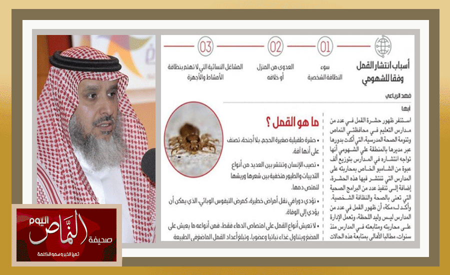 استنفر ظهور حشرة القمل في عدد من مدارس التعليم في محافظتي النماص وتنومة الصحة المدرسية، التي أكدت أنها تواجه انتشاره في المدارس بتوزيع ألف عبوة من الشامبو الخاص بمحاربته على المدارس التي تنتشر فيها هذه الحشرة، إضافة إلى تنفيذ عدد من البرامج الصحية التي تعنى بالصحة والنظافة الشخصية. وأكد أن ظهور القمل في عدد من المدارس ليس وليد اللحظة، وتعمل الإدارة على محاربته ومتابعته في المدارس منذ سنوات، مطالبا الأهالي بمتابعة هذه الحالات لدى بناتهم والتأكد من سلامتهن، مشيرا إلى أن تدني النظافة الشخصية تمثل السبب الأكبر في انتشار هذه الحشرة. ونفى ما يثار عن دور القرود في انتشار هذه الحشرات، مشيرا إلى أنه ليس لها علاقة على الرغم من تسلل بعضها للمدارس يوميا بحثا عن بقايا خبز وطعام.