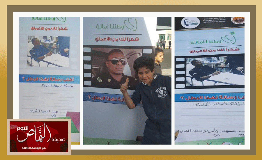 تكريماً للموقف البطولي المشرف الذي قام به رجل الأمن / جبران عواجي، في القضاء على أرباب الإرهاب. قامت مدرسة الجزيرة الابتدائية بالهيئة الملكية بالجبيل، بمبادرة رائعة في تجسيد قوة التلاحم بين المواطن ورجل الأمن، حيث ترجم طلاب المدرسة مشاعرهم تجاه رجل الأمن / جبران عواجي ، ضمن فعالية أقامها نادي العطاء والتطوع لطلاب المدرسة بكتابة رسالة شكر وامتنان لهذا البطل، شارك فيها حوالي 50 طالباً من مختلف المراحل الدراسية والتي حملت في طياتها صدق المشاعر والفخر ببطل الوطن جبران عواجي. الجدير بالذكر أن بطل الوطن جبران عواجي قام بعمل بطولي بمواجهة الإرهابيين، يوم السبت الماضي، في حي الياسمين بالرياض، والذي سيظل موقفاً ملهماً للأجيال القادمة في حماية الوطن.