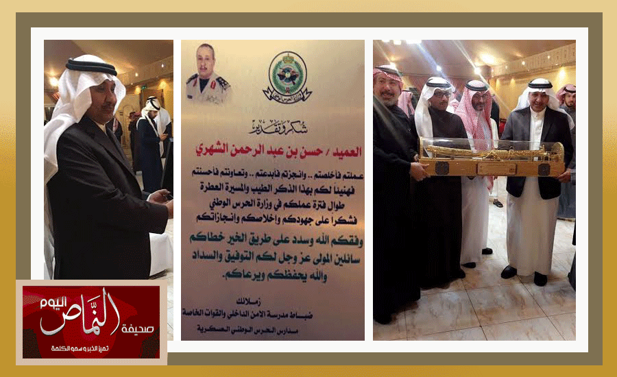 كرم ضباط مدرسة الأمن الداخلي والقوات الخاصة بمدارس الحرس الوطني العميد حسن بن عبدالرحمن الشهري، وذلك إثر صدور تقاعده بعد خدمته لأكثر من 34 عاماً. وأعربوا عن شكرهم على ما لمسوه من تعاونه معهم وتفانيه في أداء عمله، مؤكدين أن هذا التكريم جزء قليل مما يستحقه نظير تميزه وحسن تعامله خلال عمله معهم. من جهته ثمن العميد متقاعد الشهري البادرة غير المستغربة من زملائه في تكريمه، مقدماً شكره وتقديره لهم على ما حظي به من تعاونهم خلال فترة عمله.