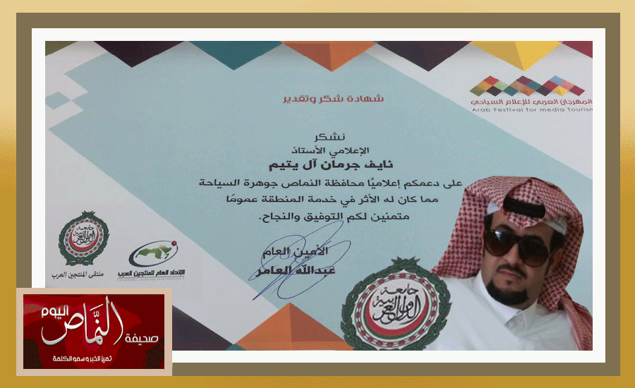 شكر المهرجان العربي للإعلام السياحي التابع – لجامعة الدول العربية – الأستاذ نايف بن جرمان آل يتيم الشهري على جهوده الإعلامية الداعمة لمحافظة النماص – جوهرة السياحة العربية – مما كان له الأثر في خدمة المنطقة عموماً، متمنياً له التوفيق والنجاح ، كما تهنئ صحيفة – النماص اليوم – الإعلامي المتميز أ. نايف الشهري بمناسبة تكريمة من لدن – المهرجان العربي للإعلام السياحي – متمنين له المزيد من التوفيق، ومواصلة العطاء والإبداع لخدمة محافظة النماص خصوصاً ومنطقة عسير والوطن عموماً .