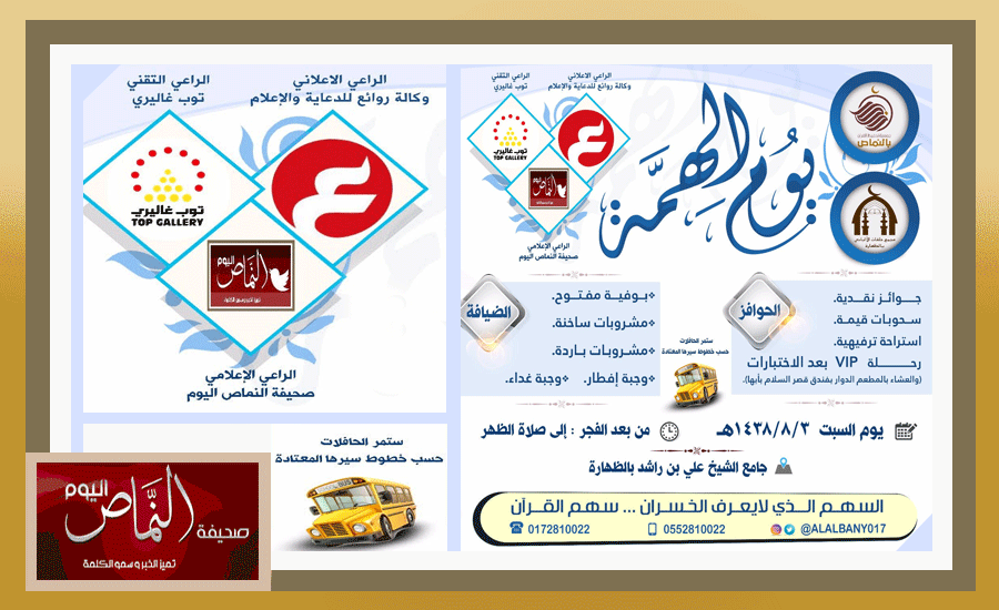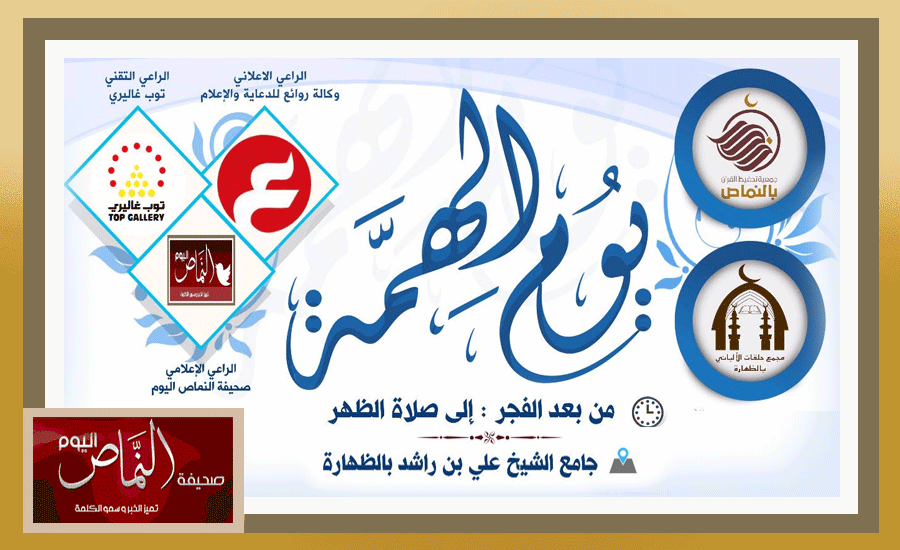 تقيم جمعية تحفيظ القرآن الكريم التي يرأس مجلس ادارتها فضيلة الشيخ د. صالح بن ناعم العمري برنامج – يوم الهمة – بجامع الظهارة بمحافظة النماص يوم السبت الموافق 3/8/1438هـ من بعد صلاة الفجر وحتى صلاة الظهر، وصرح الشيخ عوض الجحدله لـ – للنماص اليوم – بأن البرنامج سيبدأ من بعد صلاة الفجر وحتى أذان الظهر وسيخصص جزء من الوقت للمراجعة المركزة لحفظ القرآن الكريم حيث يراجع فيه طلاب الحلقه جميع ماتم حفظه من أول العام بإتقان، ويرافق البرنامج فقرات راحه وترويح ووجبات غذائية وجوائز نقدية وسحوبات قيمة للمتميزين، وتستقبل اللجنة المنسقة للبرنامج دعم الأسر المنتجة ( شاي، قهوة، حليب، بيتزا، ورق عنب .. إلخ ) أو ما يجود به الأهالي من طبخ المنزل، ومن أرادت من الأمهات الفاضلات المساهمة فعليها التواصل على جوال المجمع ( رسالة نصية فقط – حسب الرقم الموجود في البرشور المرفق ) … وسيكون هناك تقرير مفصل – بإذن الله – بعد نهاية البرنامج .