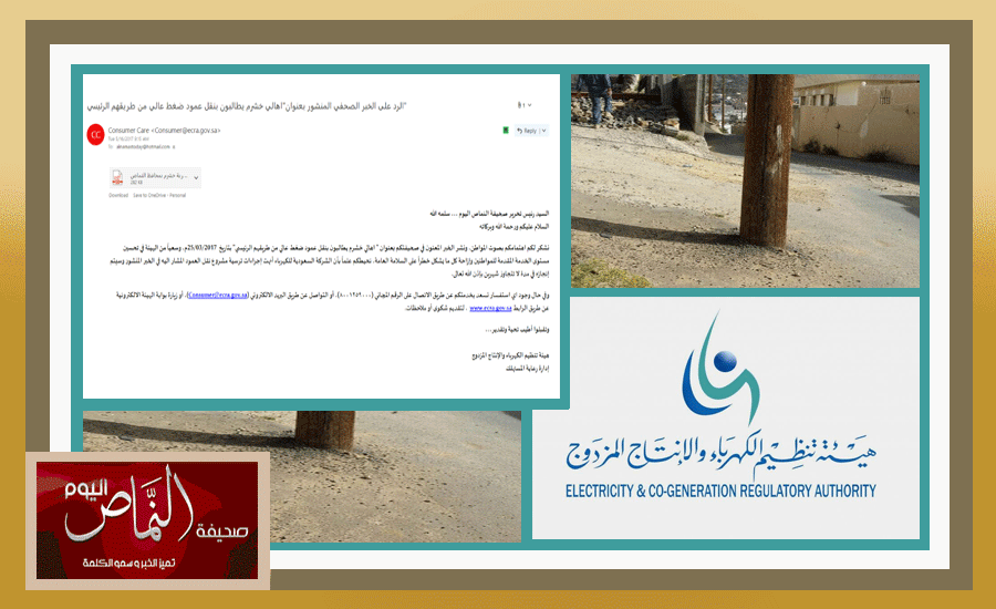 أنهت هيئة تنظيم الكهرباء والانتاج المزدوج معاناة اهالي قرية خشرم عن طريق الخبر المنشور بتاريخ 25/03/2017م تحت عنوان ” اهالي خشرم يطالبون بنقل عمود ضغط عالي من طريقهم الرئيسي” والتي استمرت المطالبات بين أخذ ورد بين المواطنين وشركة الكهرباء لسنين، في الوقت الذي استجابت الهيئة وفِي وقت يوصف بالقياسي لإنهاء هذه المشكلة التي كانت تؤرق ساكني القرية وما يتعرضون له من خطر حيث تلقت – النماص اليوم – رد الهيئة بتوجيه الشركة السعودية للكهرباء بنقل العمود خلال الشهرين القادمة، يأتي ذلك في إطار حرص الهيئة في الحفاظ على حقوق المواطنين ورفع مستوى تنظيم الخدمة الكهربائية المقدمة على مستوى المملكة. – النماص اليوم – تتقدم بالشكر والتقدير لهيئة تنظيم الكهرباء والانتاج المزدوج على حرصهم وتفاعلهم المستمر لكل ما يهم المواطنين.