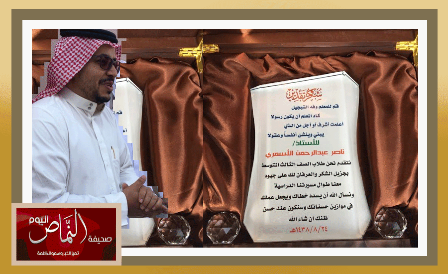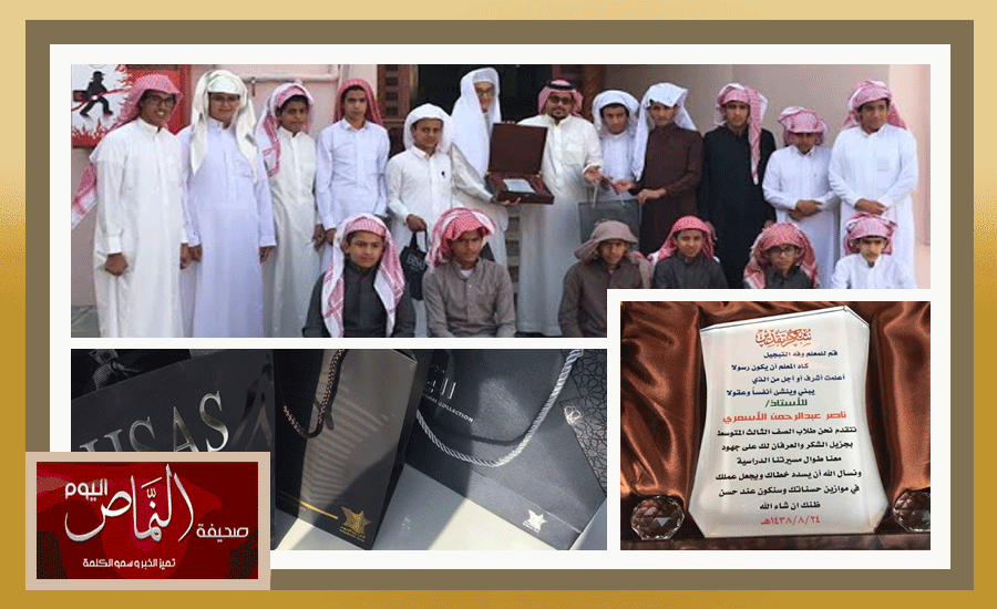 مع نهاية اختبار اليوم الأثنين الموافق 8/26 قام طلاب الصف الثالث المتوسط بمجمع الحسين بن علي التعليمي بتعليم النماص بتكريم معلم التربية الإسلامية الأستاذ / ناصر عبد الرحمن الأسمري ،وقد أوضح قائد المجمع أ.خالد آل قحيم بأن هذه المبادرة تدل على القيم الجميلة التي يتمتع بها طلابنا ومايتمتع به المعلم من قدوة حسنة وتعزيز قيم هؤلاء الطلاب ،وأضاف آل قحيم : في حين نرى من الإساءة وسوء السلوك من بعض الطلبة تجاه مدارسهم ومعلميهم نرى الخير والنور والسلوك الكريم في كثير من طلابنا الذين هم ثروة الأمة والوطن حين يجدون الرعاية والعناية والرفق والإهتمام . وأكد آل قحيم على حسن التعامل والإنصاف مع الطلبة والقيام بالأمانة التي ولاهم الله إياها من قادة ومعلمين ومسؤولين وتفعيل القيم التي تنادي بها عقيدتنا السمحة وركزت عليها الوزارة في برامجها مثل برنامج فطن وحصانة ورفق وغيرها …. سائلا الله عز وجل أن يحفظ على مملكتنا عقيدتها وشموخها وأن يبارك جهود وزارتنا وإدارتنا ومعلمينا وطلابنا الذين هم ثروتنا الغالية . وهل جزاء الإحسان إلا الإحسان كما عبرالأسمري عن سروره الكبير بهذه المبادرة من طلابه وماتحمل تلك العقول والقلوب من مشاعر وتمنى لهم التوفيق والسداد وأن يكونوا ممن يصل إلى منصات التتويج وقيادة الأمة.