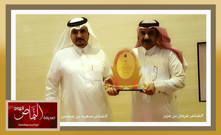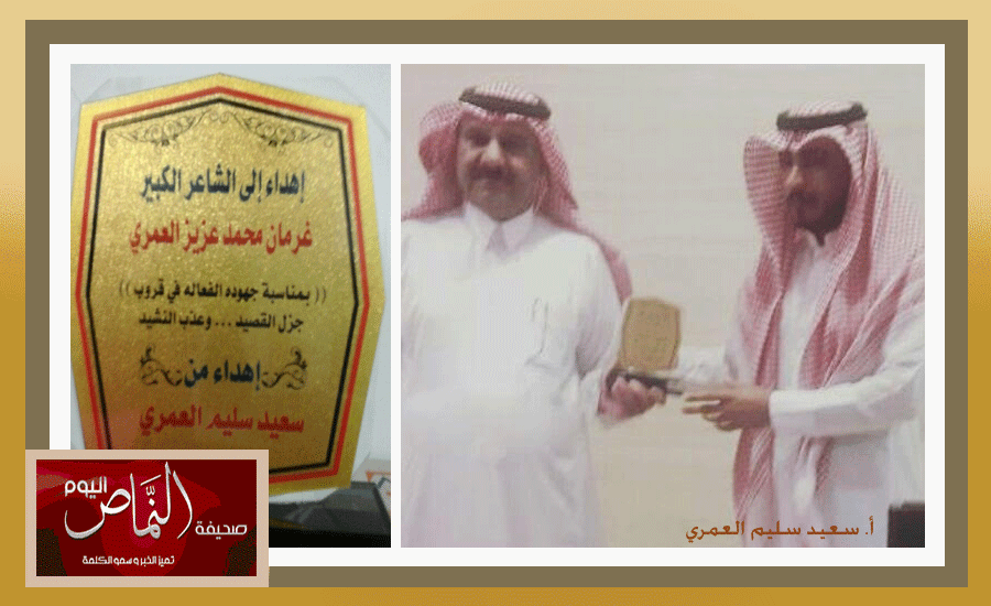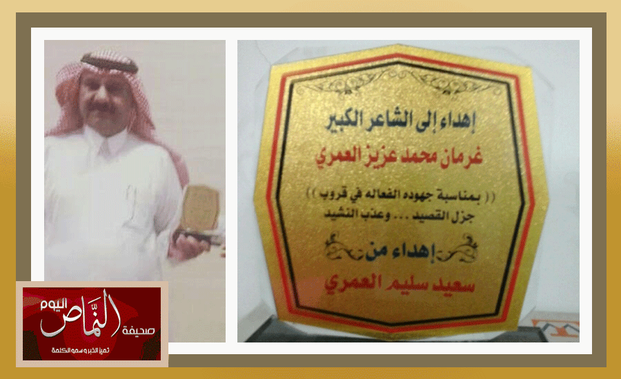 أقام الشاعر غرمان بن عزيز العمري مسابقة شعرية في ديوانية ( جزل القصيد وعذب النشيد ) للشعراء والمنشدين . وهي عبارة عن خمسة أبيات يكتبها الشاعر بعنوان ( جنودنا على حدودنا ) وتنافس على هذه المسابقة أكثر من 130 شاعر ومنشد، وقد فاز بهذه المسابقة الشعرية الوطنية الشاعر سعيد بن عنقص القحطاني، وتسابق على انشادها عدداً من المنشدين وفاز بها المنشد عبدالعزيز مبارك الاسمري، وتم تكريمهم – الشاعر والمنشد – بدروع تذكارية قدمها لهم الشاعر غرمان بن عزيز، ومن ثم قام الشاعر أ. سعيد سليم العمري – أحد شعراء الديوانية – بتقديم درع تذكاري لراعي المسابقة الشاعر المعروف والمحبوب ا. غرمان بن عزيز نظير فكرته ودعمه لها . تجدر الاشارة إلى أن أداء القصيد بالإنشاد سيكون بعد شهر رمضان الكريم، وسوف يتم نشرها هنا في – النماص اليوم – بإذن الله .
