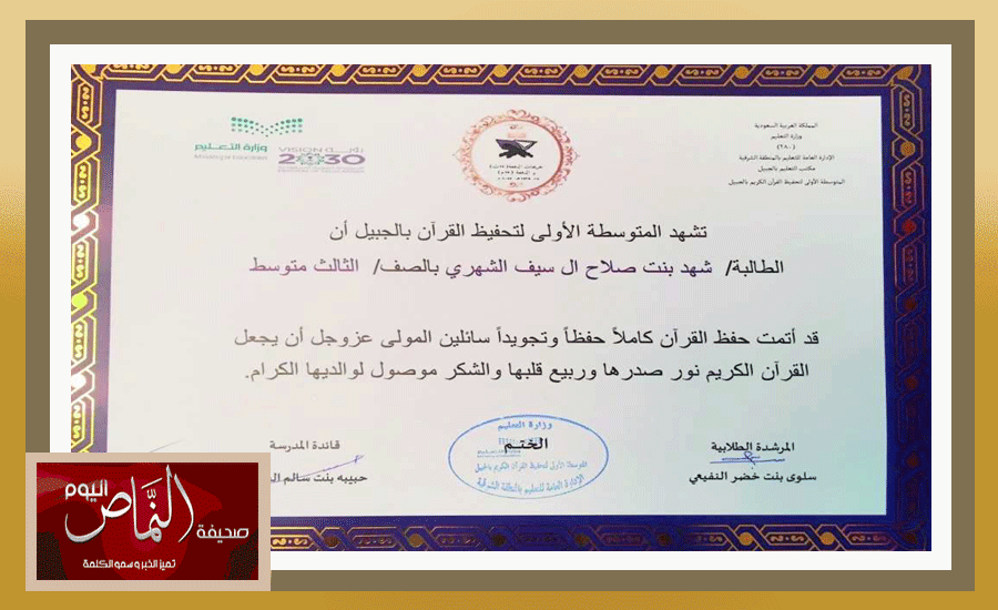 يتنافس خمسة من أبناء صلاح الشهري في شهر رمضان على حفظ القران الكريم ترتيلاً وتجويداً وأحكاماً، بعد أن انتهت الشقيقتان رغد وشهد من ختم آياته المحكمات وجرى تكريمهما من قبل المدرسة المتوسطة الأولى في الجبيل بينما دخلت لمى وسلطان السباق مع الصغير فيصل الذي لا يزال في الصف الأول الإبتدائي للحصول على الشرف نفسه . وقال صلاح الشهري ” أنعم الله علي ووهبني ثلاث بنات وابنين ، اكبرهم رغد التي أنهت الصف الثاني ثانوي مقرارات وبتوفيق من الله حصلت على تقدير ممتاز وحفظت كتاب الله كاملا مع التجويد لعام 1436هـ  من المدرسة المتوسطة لتحغيظ القرآن بالجبيل الصناعية، والثانية شهد أنهت ثالث متوسط بتقدير ممتاز وحصلت على شهادة اتمام حفظ القران الكريم مع التجويد من المدرسة ذاتها ” مشيراً إلى ان لمى اتمت حفظ  15 جزءا من القرآن ‏وحصلت على التفوق من المدرسة الأولى لتحفيظ القرآن بالجبيل الصناعية بالصف السادس الابتدائي لهذا العام. اما سلطان فقد حفظ 10 أجزاء من مدرسه الإمام عاصم بالجبيل الصناعية ويسير فيصل الطالب بالصف الأول الابتدائي في ركب اخوانه ويواصل حفظ آيات القرآن الكريم  . ويؤكد الشهري انه اتفق معه زوجته عزيزة سعد سلطان القحطاني – معلمة خريجة جامعة أم القراى تخصص الجغرافيا – على إدخالهم حلقات تحفيظ القرآن الكريم لما لها من اهمية في حياة كل مسلم  وقال ” لاحظنا ولله الحمد اثر القران الكريم على هدوء الابناء واعطائهم القدرة على استيعاب المواد الاخرى وحرصت زوجتي على تربية أبنائنا على القرآن الكريم وتعاليمه ومتابعتهم وحثم على المثابرة وتهيئة الجو المنزلي لهم وتشجيعه هم على الحفظ” ‏وأضاف ” ظهر تأثير حفظ القرآن الكريم على ابنتي رغد بعد انتقالها للثانوية العامة، إذ مساهمة في فهم واستيعاب المواد العلمية وسرعة الحفظ ما جعلها مميزة امام معلماتها وزميلاتها ” .