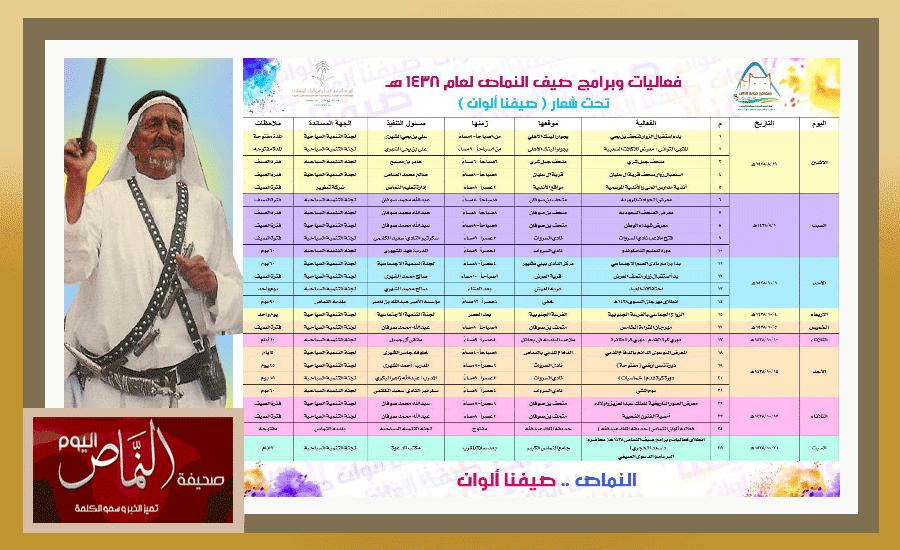 يدشن سعادة محافظ النماص رئيس لجنة التنمية السياحية بالمحافظة الأستاذ عبدالله بن عايض العجيري باقة من فعاليات – صيفنا ألوان 38 – في 21 من شهر شوال الحالي حيث ستتنوع مابين دورات وبرامج توعوية للرجال والنساء وليال تراثية ومسابقات وبطولة ( سلمان الخير ) في نسختها التاسعة، وتفعيل برنامج ( ساند ) لاستقبال أطفال التوحد، ورحلات جماعية، ومعارض فوتوغرافية، وأمسيات متنوعة لجميع شرائح المجتمع، وعدد من الندوات الهادفة. تجدر الإشارة إلى أن عدد من فعاليات صيف النماص 1438 تحت شعار ( صيفنا ألوان ) قد أقيمت بإشراف من لجنة التنمية السياحية بالمحافظة بدءا من الأسبوع الثالث من شهر شعبان الماضي حيث تم استقبال الزوار في عدد من المتاحف والقرى التراثية وإقامة معارض للمبدعين والمبدعات في الفن التشكيلي وللأسرالمنتجة من خلال تقديم المأكولات الشعبية وغيرها من الحرف اليدوية وصناعة المنسوجات. ومع بداية شهر رمضان تم افتتاح عدد من المعارض والفعاليات مثل ( الحوادث المرورية، الصحف السعودية، شهداء الوطن، ملاعب نادي السروات، ودورات في التايكوندو ). ومع أول أيام عيد الفطر المبارك نفذت برامج ومهرجانات للتسوق.