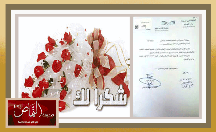 قدم سعادة المشرف العام للعلاقات العامة والإعلام بالوزارة الأستاذ / محمد بن سعد الدخيني بخطاب شكر وتقدير للأستاذة / نورة بنت ظافر مشبب الشهري مساعدة مدير الإعلام التربوي لجهودها المتميزة في توثيق الملف الإعلامي للوزارة للعام 1438/1437 هـ . كما قدم قسم الإعلام التربوي بتعليم النماص برئاسة الأستاذ/ صالح بن عمرالشهري مباركته للزميلة الأستاذة/ نورة الشهري بهذا التميز المعتاد سائلين الله لها دوام التوفيق والسداد .