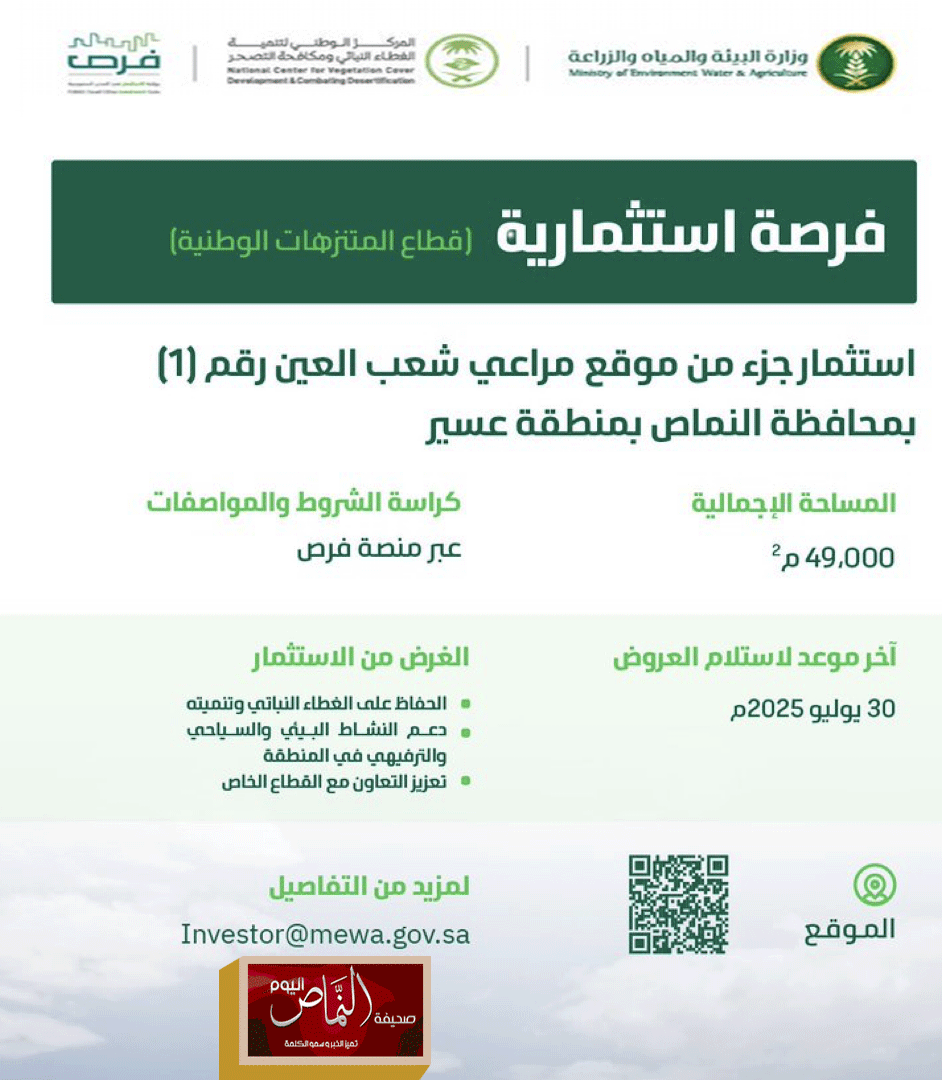أعلنت وزارة الزراعة عن طرح فرصة لاستثمار جزء من موقع مراعي شعب العين رقم (1) بمحافظة النماص في منطقة عسير، بمساحة اجمالية تقدر بـ 49000 م2، كما أعلت عن آخر موعد لإستلام العروض في 30 يولية 2025م والتقديم عن طريق كراس الشروط والمواصفات عبر منصة “فرص”، وتهدف الوزارة الى الحفاظ على الغطاء النباتي وتنميته ودعم النشاط البيئي والسياحي والترفيهي في المنطقة وتعزيز التعاون مع القطاع الخاص.