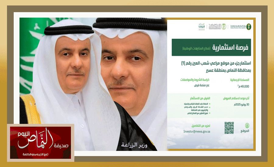 أعلنت وزارة الزراعة عن طرح فرصة لاستثمار جزء من موقع مراعي شعب العين رقم (1) بمحافظة النماص في منطقة عسير، بمساحة اجمالية تقدر بـ 49000 م2، كما أعلت عن آخر موعد لإستلام العروض في 30 يولية 2025م والتقديم عن طريق كراس الشروط والمواصفات عبر منصة “فرص”، وتهدف الوزارة الى الحفاظ على الغطاء النباتي وتنميته ودعم النشاط البيئي والسياحي والترفيهي في المنطقة وتعزيز التعاون مع القطاع الخاص.