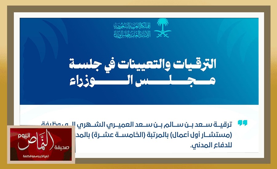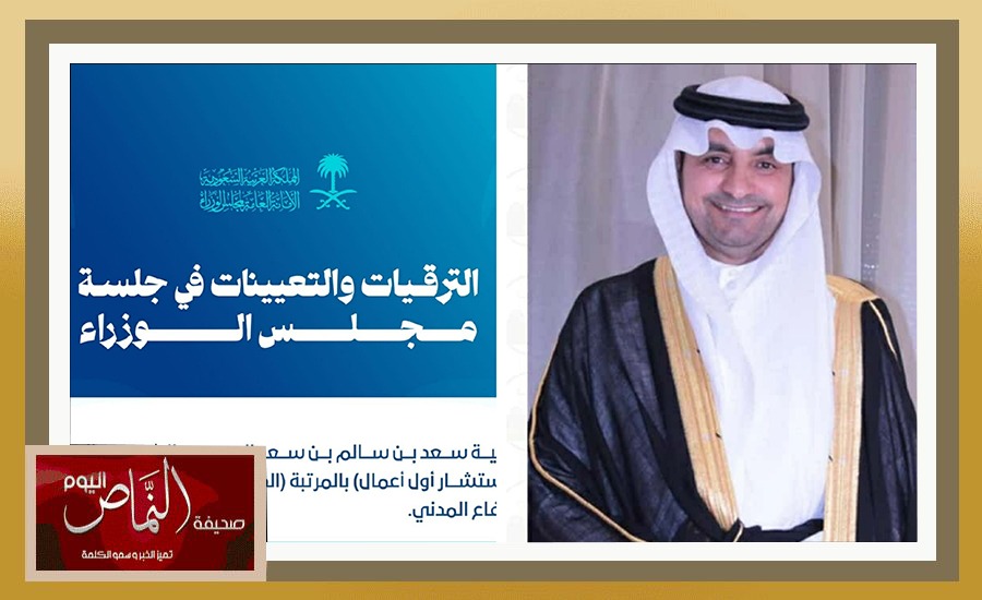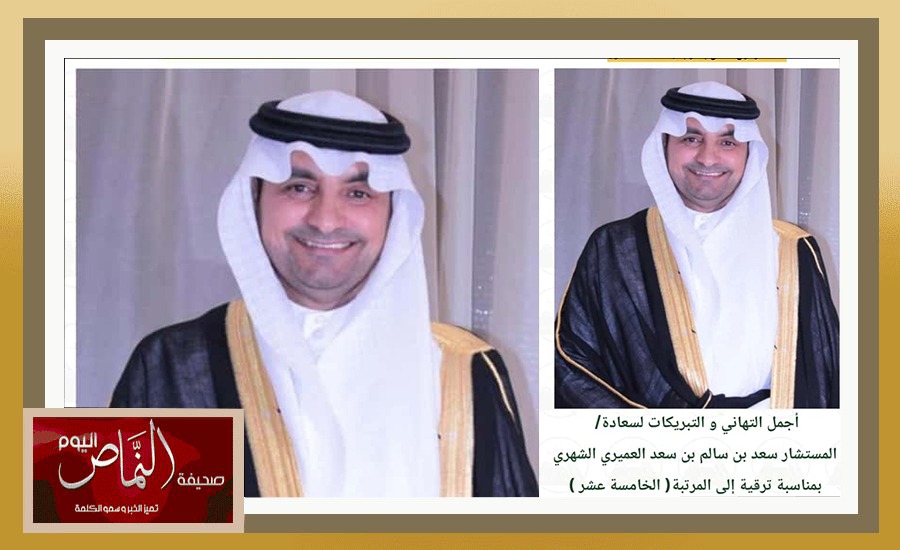 تلقى المستشار سعد بن سالم العميري الشهري التهاني والتبريكات بمناسبة تعيينه مستشارا بالمرتبة الخامسة عشر بالمديرية العامة للدفاع المدني ، وصحيفة النماص اليوم تتقدم لسعادة المستشار سعد الشهري بخالص التهاني والتبريكات بهذه المناسبة ، سألين المولى عز وجل بان تكون عونا له على طاعته وخدمة لدينه ومليكه ووطنه .