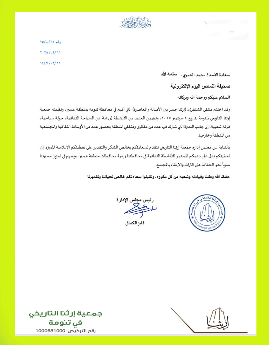 شكر الدكتور فايز الكفافي رئيس مجلس إدارة جمعية – إرثنا التاريخي – بتنومة.. صحيفة “النماص اليوم” على جهودها المتميزة في تغطية فعاليات ملتقى الشنفري الأول الذي أقيم بتنومة يوم الخميس 12/ 3/ 1447هـ 4/ 9/ 2025م بحضور سعادة محافظ تنومة عبدالعزيز بن عبدالله آل عزيز، وقد أعرب الدكتور الكفافي بالنيابة عن مجلس إدارة جمعية إرثنا التاريخي عن خالص الشكر و التقدير على التغطية الإعلامية المميزة التي قامت بها صحيفة – النماص اليوم – في هذا الملتقى التاريخي، وقال الكفافي : إن تغطيتكم تدل على دعمكم المستمر للأنشطة الثقافية في محافظتنا “تنومة” وبقية محافظات منطقة عسير، ويسهم في تعزيز مسيرتنا سوياً نحو الحفاظ على التراث والارتقاء بالمجتمع. حفظ اللّٰه وطننا وقيادته وشعبه من كل مكروه، وتقبلوا سعادتكم خالص تحياتنا وتقديرنا
