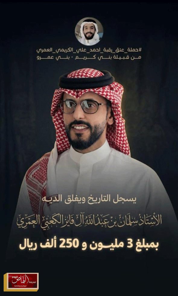 شكر الشيخ محمد بن حسن بن زهير آل وافي العمري، – شيخ شمل قبائل كعب بني عمرو – ، أصالة عن نفسه ونيابة عن مشايخ ونواب وأعيان وأفراد قبائل كعب بني عمرو، في جميع مناطق المملكة.. الأستاذ سلمان بن عبدالله آل فايز الكعبي العمري، لتبرعه السخي لاغلاق دية الشاب أحمد بن علي الكريمي العمري، بمبلغ 3 مليون ومائتان وخمسون ألف ريال، وما يمثله هذا الدعم من موقف إنساني نبيل ينم عن شخصية وطنية أصيلة تظهر في المواقف الصعبة والأزمات الحانقة، لتمثل عظم الأخلاق النبيلة التي اتسم بها أبناء هذا الشعب الكريم منذ تأسيسه على يد والدنا الملك عبدالعزيز بن عبدالرحمن آل سعود، ومن بعده أبناءه البرره، وصولاً إلى خادم الحرمين الشريفين الملك سلمان بن عبدالعزيز، وولي عهده الأمين الأمير محمد بن سلمان – حفظهم الله – .