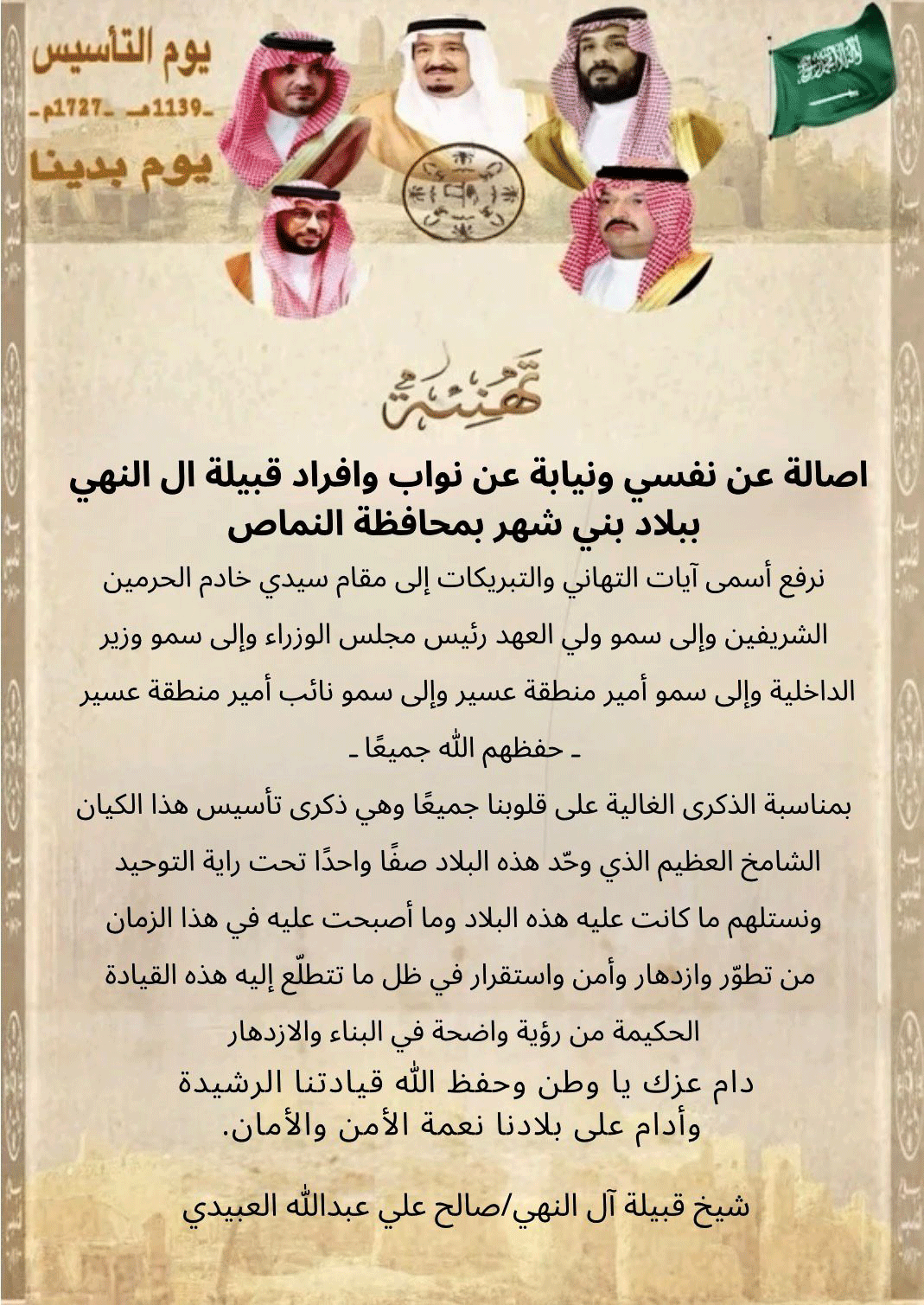 تقدم الشيخ صالح بن علي العبيدي الشهري – شيخ قبيلة آل النهي – أصالة عن نفسه ونيابة عن نواب وأفراد قبيلة آل النهي – ببلاد بني شهر بمحافظة النماص – بأسمى آيات التهاني والتبريكات إلى مقام خادم الحرمين الشريفين الملك سلمان بن عبدالعزيز آل سعود، وإلى سمو ولي العهد صاحب السمو الملكي الأمير محمد بن سلمان بن عبدالعزيز آل سعود، وإلى سمو وزير الداخلية صاحب السمو الملكي الأمير عبدالعزيز بن سعود بن نايف بن عبدالعزيز، وإلى سمو أمير منطقة عسير صاحب السمو الملكي الأمير تركي بن طلال بن عبدالعزيز آل سعود، وإلى سمو نائب أمير منطقة عسير صاحب السمو الملكي الأمير خالد بن سطام بن سعود بن عبدالعزيز آل سعود، بمناسبة يوم التأسيس لهذا الكيان الشامخ العظيم، الذي وحّد هذه البلاد صفا واحداً تحت راية التوحيد. الذي نستلهم ما كانت عليه هذه البلاد، وما أصبحت عليه في هذا الزمان من تطور وازدهار وأمن واستقرار، في ظل ما تتطلع إليه هذه القيادة الحكيمة من رؤية واضحة في البناء والازدهار. داعياً المولى عز وجل بأن يحفظ المملكة العربية السعودية، وأن يديم مجدها وعزها في ظل قيادتها الرشيدة.