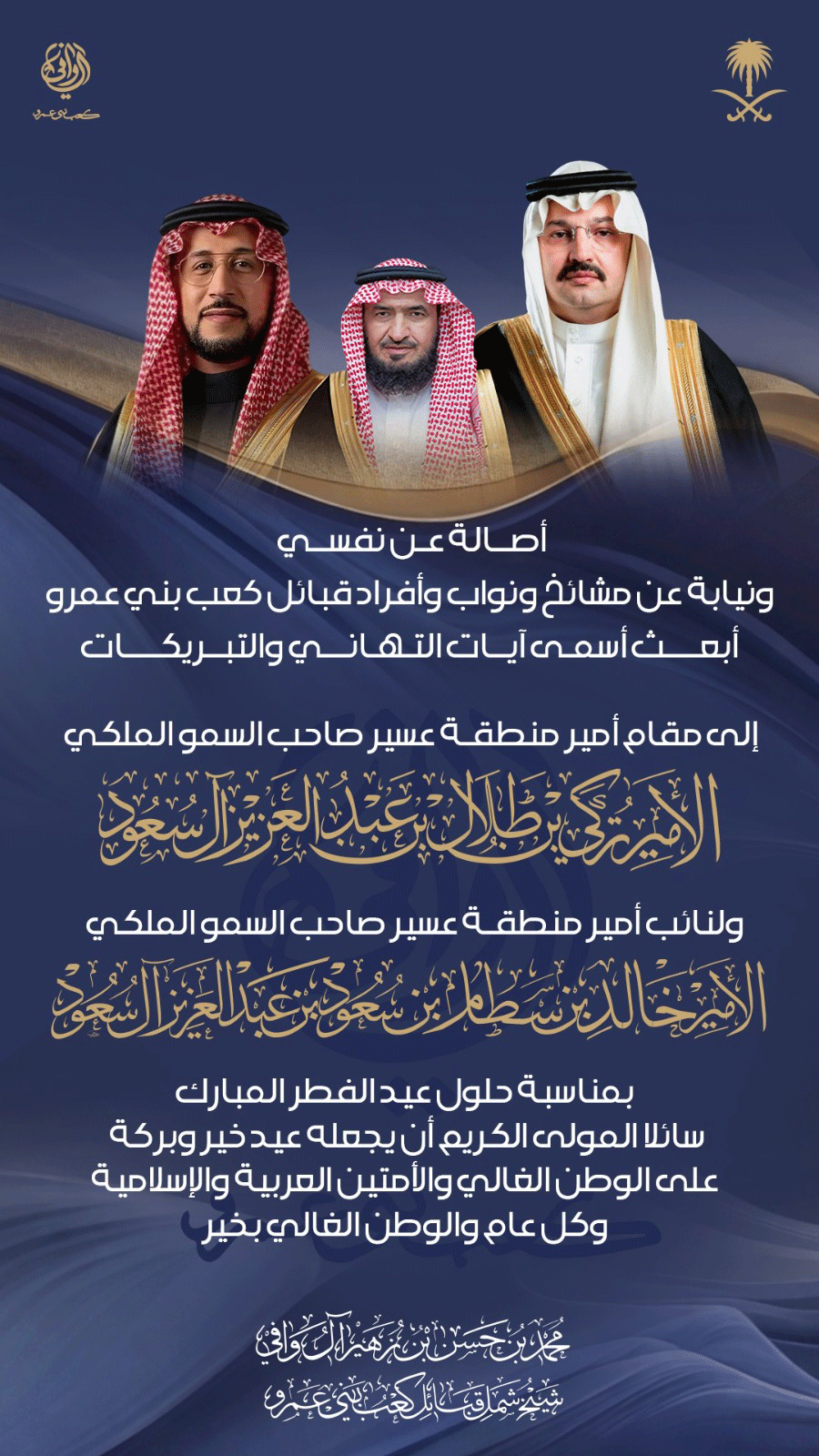 رفع الشيخ محمد بن حسن بن زهير آل وافي العمري، “شيخ شمل قبائل كعب بني عمرو” ، بأسمى آيات التهاني والتبريكات إلى سمو أمير منطقة عسير، صاحب السمو الملكي الأمير تركي بن طلال بن عبدالعزيز، وإلى سمو نائبه صاحب السمو الملكي الأمير خالد بن سطام بن سعود بن عبدالعزيز، بمناسبة عيد الفطر المبارك، سائلا المولى عز وجل أن يجعله عيد فرحة وسرور لكل المسلمين، وأن يعيده على الشعب السعودي والأمتين العربية والإسلامية بالخير والمسرات .