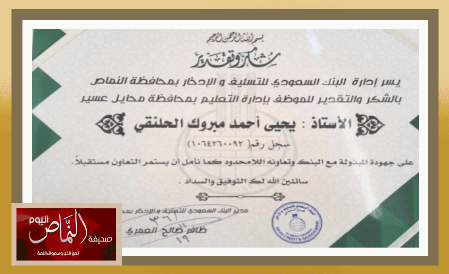 كرم مدير التعليم بمحايل عسير هاشم بن علي الحياني الموظف يحيى بن احمد مبروك الحلنقي بقسم النفقات والرواتب بالإدارة بحضور مساعد الشؤون التعليمية الأستاذ علي بن محسن ومندوب بنك التسليف بمحافظة النماص الأستاذ مانع العمري وذلك نظير جهوده وإنجازه معاملات الإدارة الخاصة بالبنك وقد شارك في مناسبة التكريم كلاً من مدير الشؤون المالية والإدارية الأستاذ علي الرايقي ومدير شؤون الموظفين وحيد الحفظي ..