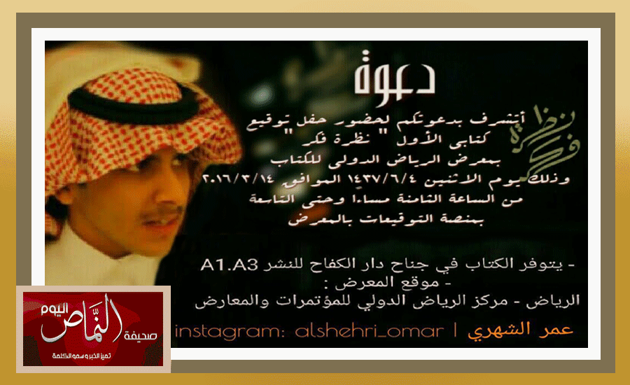 يتقدم الشاب السعودي عمر صالح الشهري بدعوة عامة للجميع وذلك لحضور مراسم حفل توقيع كتابه الأول ( نظرة فكر ) وذلك يوم الاثنين ٤/٦/١٤٣٧ الموافق ١٤ مارس ٢٠١٧ في المعرض الدولي للكتاب المقام في مدينة الرياض، من الساعة ٨ مساء الى الساعة ٩ مساء، بمنصة التوقيعات، كما أشار الكاتب بان كتاب ( نظرة فكر ) سيكون متوفراً في جناح دار الكفاح للنشر A1.A3 . الجدير بالذكر أن صحيفة – النماص اليوم – سبق وأن نشرت خبر عن كتابه ( نظرة فكر ) والإشارة بأن الكاتب يُعد أصغر كاتب سعودي حسب تقديرات دور النشر المشاركة في معرض الكتاب.