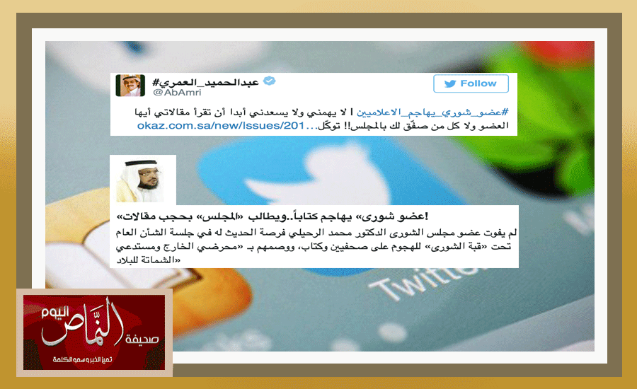 لم يفوت عضو مجلس الشورى الدكتور محمد الرحيلي فرصة الحديث له في جلسة الشأن العام تحت «قبة الشورى» للهجوم على صحفيين وكتاب، ووصمهم بـ «محرضي الخارج ومستدعي الشماتة للبلاد». وشن الرحيلي أمس هجوما على كتاب وصحفيين. واستهلك الهجوم كل المدة المتاحة للعضو في كلمته تحت قبة المجلس. وطالب الرحيلي زملاءه في الملف الصحفي بالمجلس بعدم نقل المقالات التي لا يراها جيدة، في الوقت الذي وزع صفة «الوطنية» على عضوين من الأعضاء الكتاب (أحمد الزيلعي، وفاطمة القرني)، رغم أن عدد أعضاء المجلس من الكتاب في الصحف بشكل دوري يصل إلى 12 كاتبا وكاتبة، وقال الرحيلي ساخرا في كلمته إن الحرية لو كانت بهذا الشكل « فنحن ( أي المجتمع ) لا نريدها». وقوبلت كلمة الرحيلي من الأعضاء بالتصفيق الحار. وكان عدد من الدعاة استهدفوا الصحفيين والكتاب عبر مشاركات في مواقع التواصل الاجتماعي تتهمهم بـ « النفاق والعمالة »، وتحرك إعلاميون لرفع دعوى قضائية ضد الدعاة المسيئين، ما جعل كثيرا من الدعاة يتخلصون من التغريدات المسيئة على صفحاتهم الشخصية. الأخير – العمري – يرد: لا يهمني ولا يسعدني أبدا أن تقرأ مقالاتي ولا كل من صفّق لك بالمجلس .