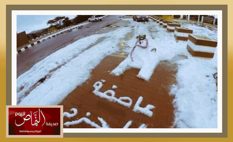 تداول نشطاء على موقع التواصل “تويتر”، صورة لعبارة عاصفة الحزم وقد شكلها مجموعة من المواطنين من زخات “البرد” التي تساقطت خلال الأيام الماضية على منطقة النماص التابعة إلى محافظة عسير. والصورة المتداولة عبارة عن تشكيل بالبرد لكلمة “عاصفة الحزم” تتوسط مربع محاط بإطار من “البرد” أيضا، فيما نحت المواطنون أعلاها مجسما على هيئة أسد مرابط. وعبر عدد كبير من المغردين عن إعجابهم بالصورة، داعين للجنود المرابطين على الحد الجنوبي بالنصر والعودة سالمين إلى ذويهم.