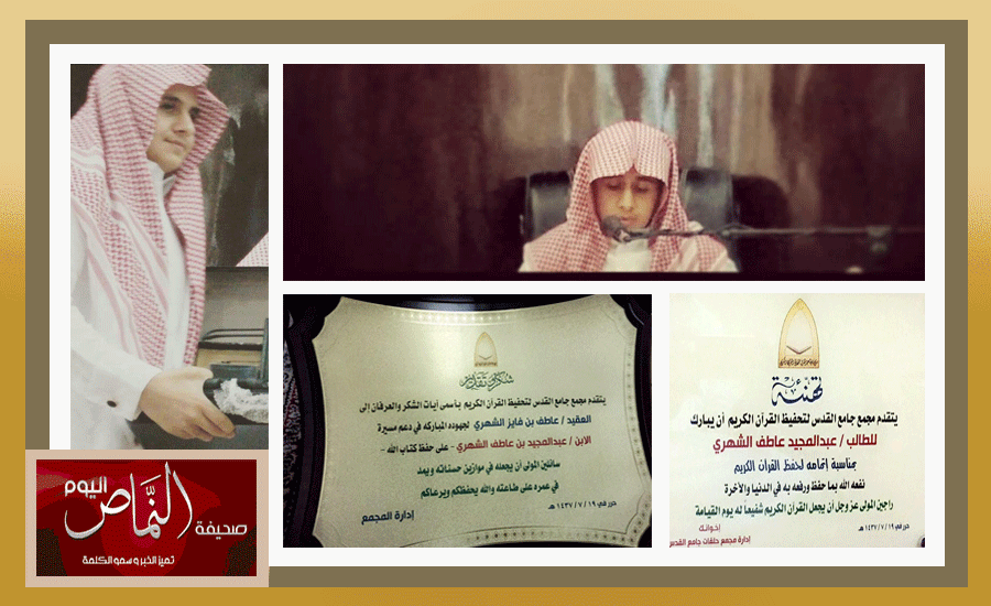 تم تكريم الطالب عبدالمجيد بن عاطف الشهري بمناسبة اتمام حفظ كتاب الله ، وكرم بهذه المناسبة والده لدوره في مساندة ومساعدة ابنه على حفظ القرآن الكريم ، وذلك على شرف الشيخ الدكتور/ إبراهيم الزبيدي .. وتم تكريم االطالب بجائزة التفوق وحصوله على المركز الأول لهذا العام 1436-1437هـ على مستوى المرحلة الثانوية بمنطقة الرياض . وبهذه المناسبة نسأل الله بأن يوفق الطالب عبدالمجيد الشهري وأن يثبته على حفظ كتاب الله ، وأن يرزقه العمل به وأن يجعله خالصا لوجهه الكريم ، وهنيئا له ولوالديه تاج الوقار .