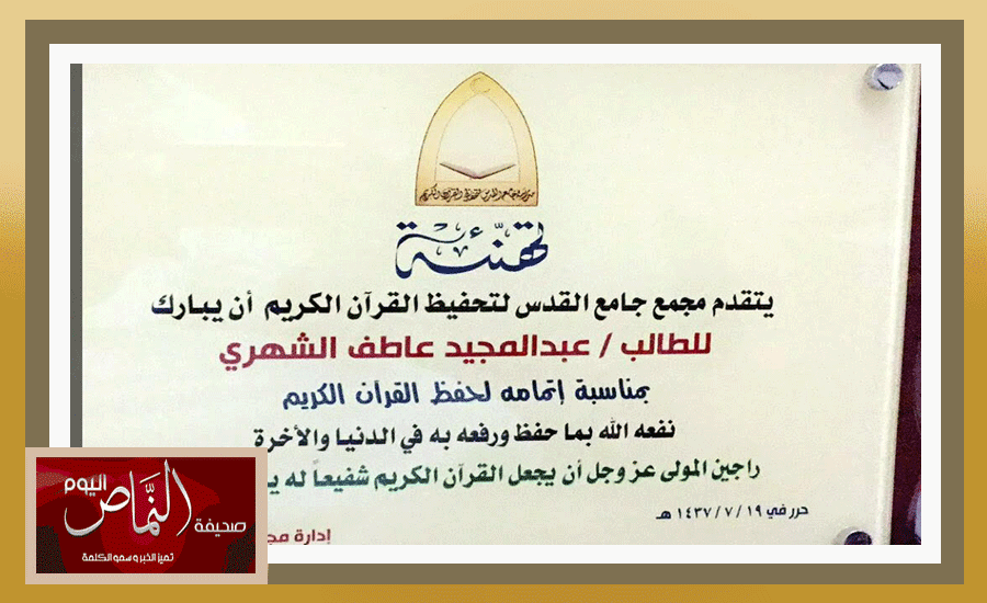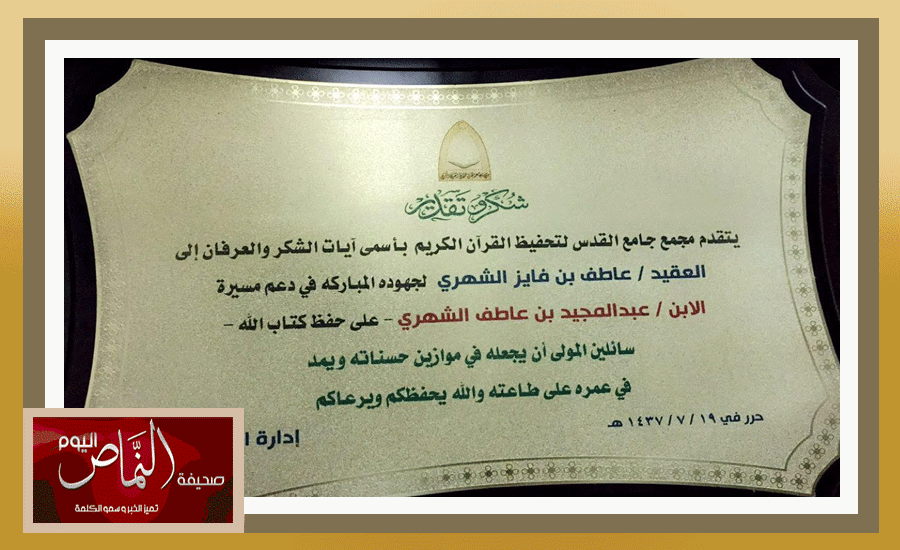 تم تكريم الطالب عبدالمجيد بن عاطف الشهري بمناسبة اتمام حفظ كتاب الله ، وكرم بهذه المناسبة والده لدوره في مساندة ومساعدة ابنه على حفظ القرآن الكريم ، وذلك على شرف الشيخ الدكتور/ إبراهيم الزبيدي .. وتم تكريم االطالب بجائزة التفوق وحصوله على المركز الأول لهذا العام 1436-1437هـ على مستوى المرحلة الثانوية بمنطقة الرياض . وبهذه المناسبة نسأل الله بأن يوفق الطالب عبدالمجيد الشهري وأن يثبته على حفظ كتاب الله ، وأن يرزقه العمل به وأن يجعله خالصا لوجهه الكريم ، وهنيئا له ولوالديه تاج الوقار .