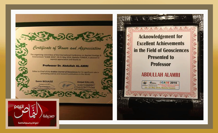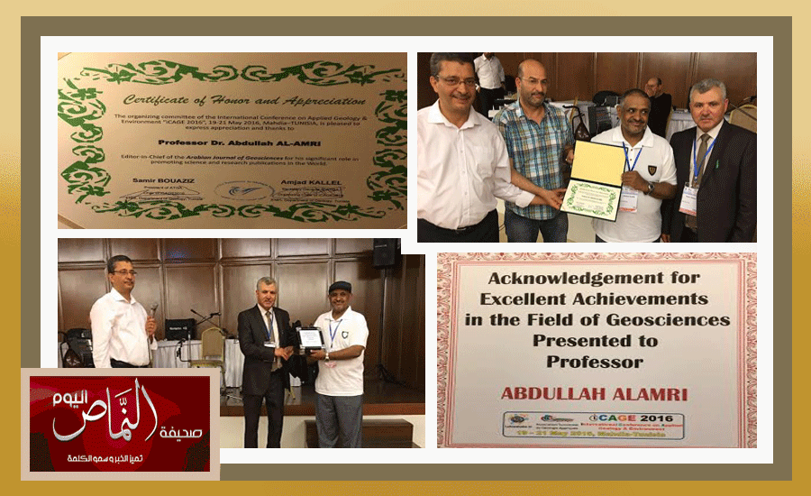 قامت الجمعية التونسية للجيولوجيا التطبيقية بتكريم سعادة الاستاذ الدكتور عبدالله بن محمد العمري رئيس الجمعية السعودية لعلوم الأرض ورئيس تحرير المجلة العربية للعلوم الجيولوجية ( جامعة الملك سعود ) وترشيحه ضيف شرف المؤتمر الدولي للجيولوجيا والبيئة ICAGE 2016 والذي عقد خلال الفترة من 19 الى 21 مايو 2016 في مدينة المهدية بتونس وحضره ماينوف عن ٥٠٠ عالم وباحث وذلك نظير انجازاته ومساهماته القيمة في تطوير مفاهيم علوم الارض علاوة على جهوده الجبارة بالقفز بالمجلة العربية للعلوم الجيولوجية الى مصاف المجلات العالمية واكتسابها سمعة علمية عالية على المستويين الاقليمي والدولي.